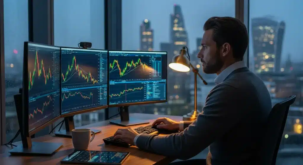 A focused trader analyzing complex financial charts on a monitor in a London apartment.